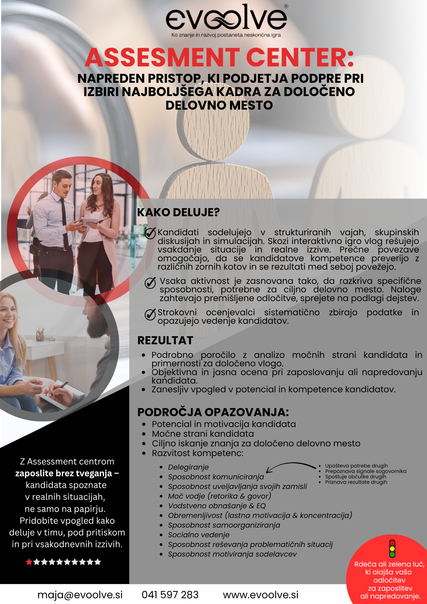 Strukturiran postopek, kjer se presoja in oceni sposobnost kandidatov za izvajanje različnih veščin, ki so običajno povezane z učinkovitim delovanjem na ciljnem delovnem mestu. Assessment center vodijo posebej usposobljeni, izkušeni svetovalci (assesorji). Ker uporabljajo situacije iz resničnega življenja, pridobijo natančne informacije o potencialni delovni uspešnosti kandidata. Po ocenjevalnem postopku bo naročnik prejel končno poročilo, ki vsebuje razčlenitev prejetih točk ocenjenih kompetenc kandidatov po vnaprej določenem kriteriju in se tako lažje odločil, kateri kandidat je najbolj primeren za posamezno delovno mesto.