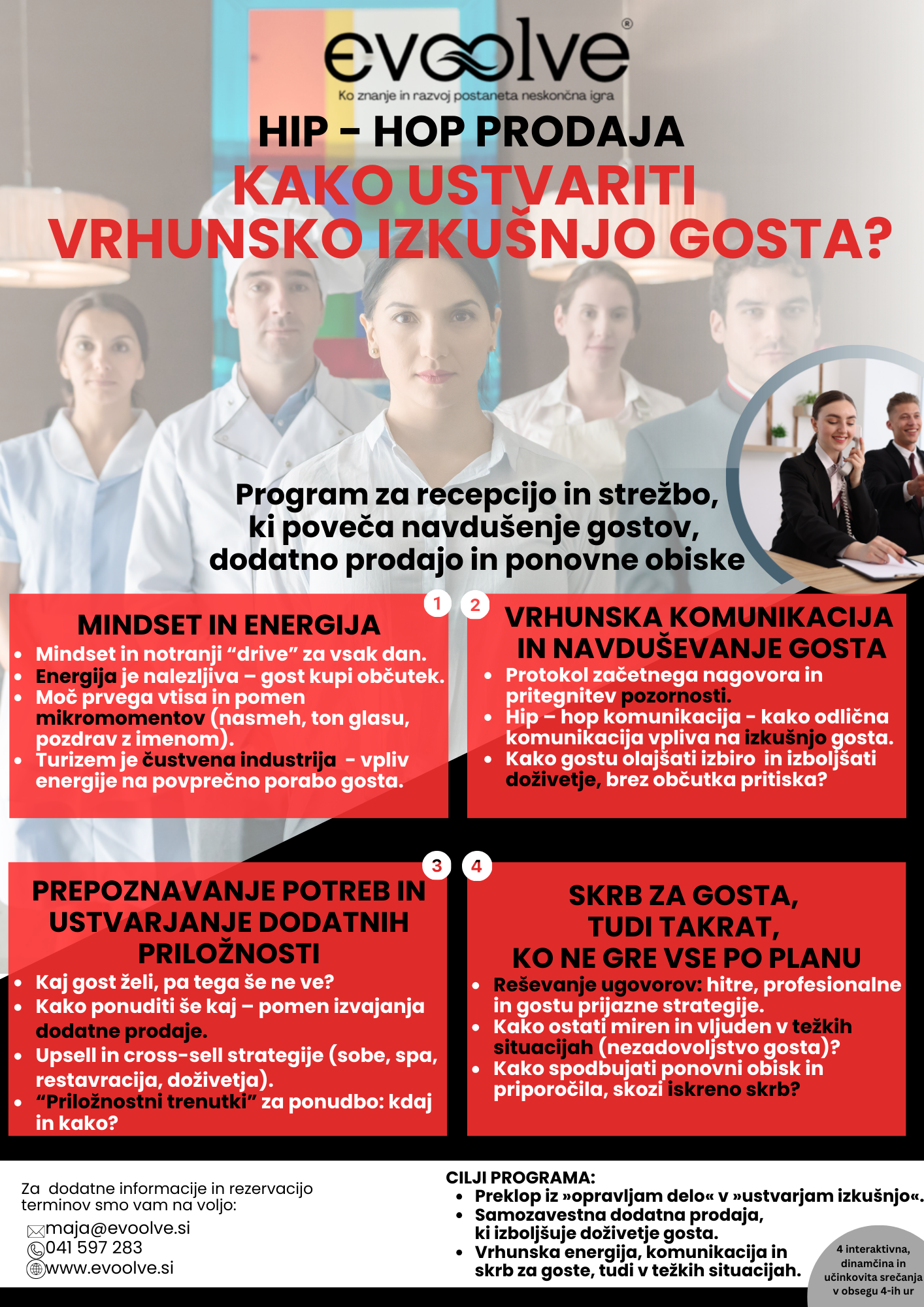 Program je namenjen sodelavcem v recepciji in strežbi in jih opremi z veščinami, ki bivanje gosta spremenijo v pravo doživetje.